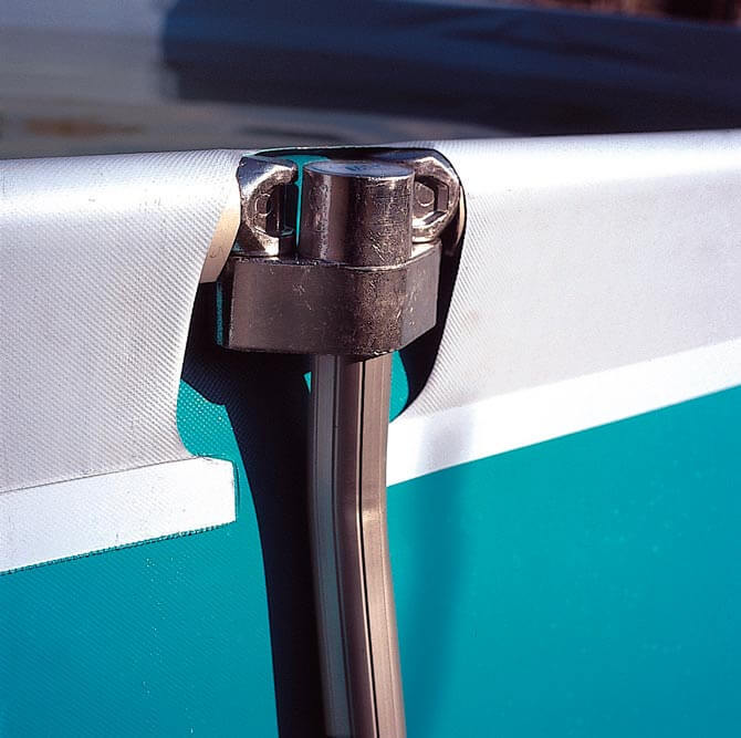 El liner o lona de la piscina está compuesto por un tejido de poliéster de alta tenacidad, recubierto de PVC por ambas caras. Con resistencias superiores a 220 y 280 Kg/ 5 cm según modelo y Tratamientos anti UVA y fungicida que garantizan una gran duración y seguridad anti desgarro. Este tipo de lona permite que en case de accidente puede ser reparado o sustituido.